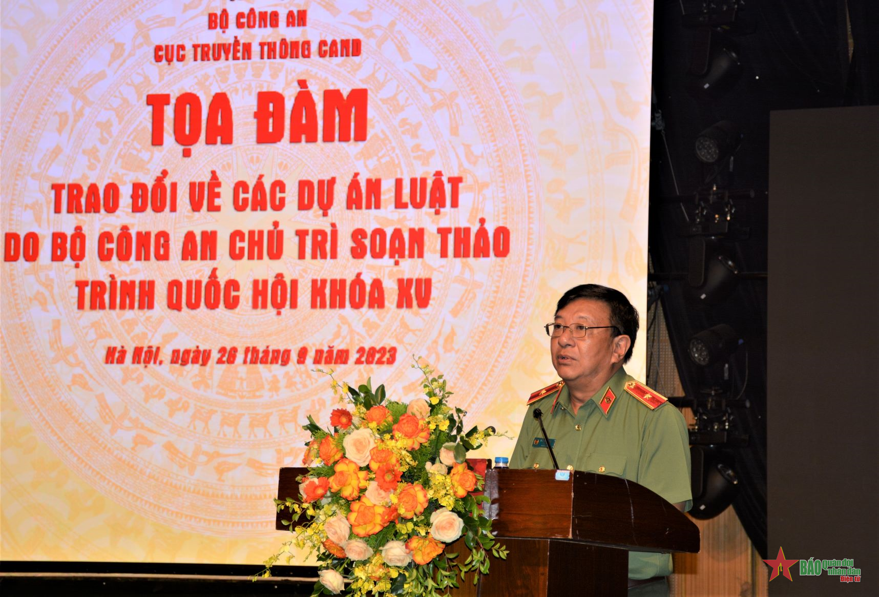 Thiếu tướng Phạm Công Nguyên, Cục trưởng Cục V03 phát biểu tại tọa đàm. Tại tọa đàm, nhiều phóng viên đã đặt câu hỏi liên quan đến các dự thảo luật và được đại diện Bộ Công an, Đại biểu Quốc hội thắn trả lời, trao đổi cởi mở.