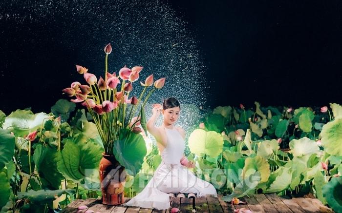 Khi chụp sen vào đêm, tất cả không gian đều rơi vào tĩnh lặng, màn đêm bao trùm thì điểm sáng nổi bật chính là gương mặt thiếu nữ