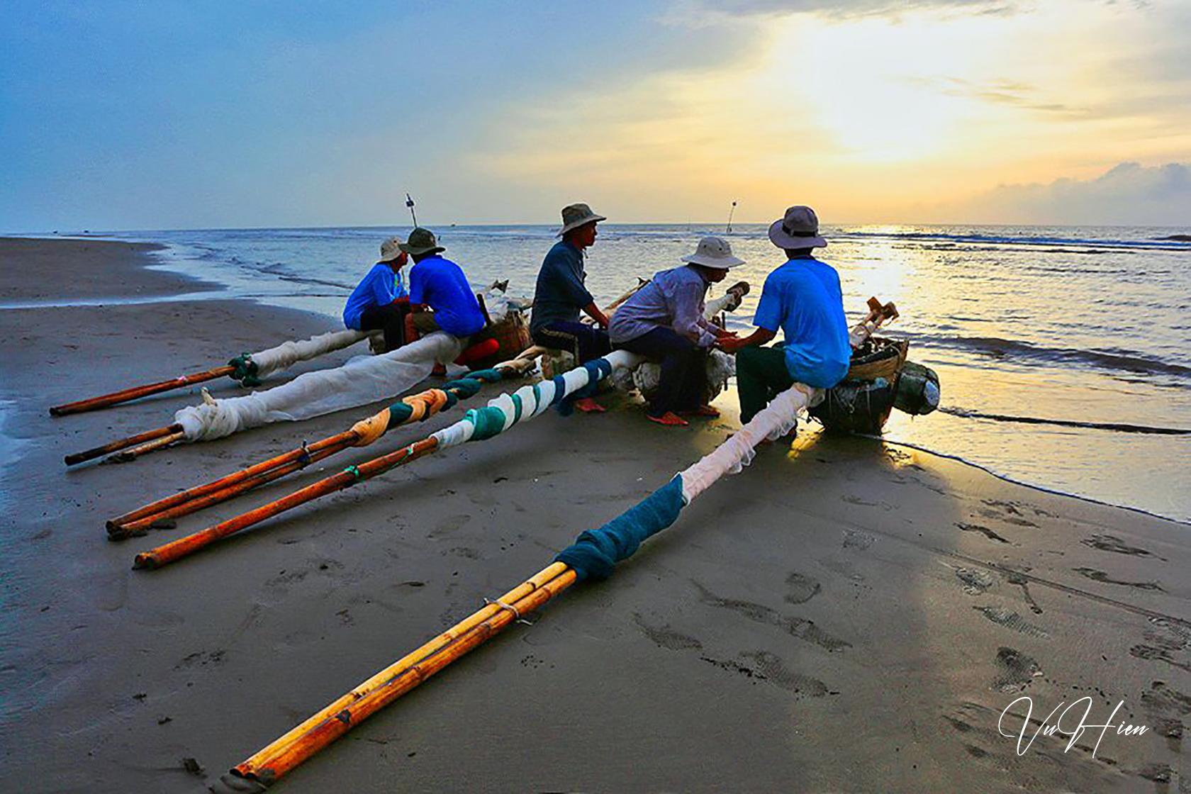 Thuê xe từ Sài Gòn xuống từ hôm trước, ngủ lại tại mấy phòng trọ cực kỳ sơ sài gần bãi biển để 5 giờ sáng hôm sau chỉ cần đi bộ ít phút là có thể gặp mấy ngư dân vác xiệp ra bãi. Trời còn tối đen, mấy anh chàng ngư dân này ngồi chờ mặt trời mọc với điếu thuốc phì phèo. Chỉ thấy mấy chấm đỏ thỉnh thoảng lóe lên trong bóng đêm. Chưa chụp được. Rồi chân trời ửng dần ánh đỏ để thấy bóng các ngư phủ in trên nền trời còn xanh đen. Bắt đầu từ đây là lúc ánh sáng và màu sắc đẹp nhất và thay đổi từng phút. Từ xanh sang vàng, cam, đỏ… Khi mặt trời lên cao hẳn thì chúng tôi thu dọn ba-lô rút lui. Cũng bấm được cả trăm tấm ảnh với đủ các sinh hoạt khác nhau.