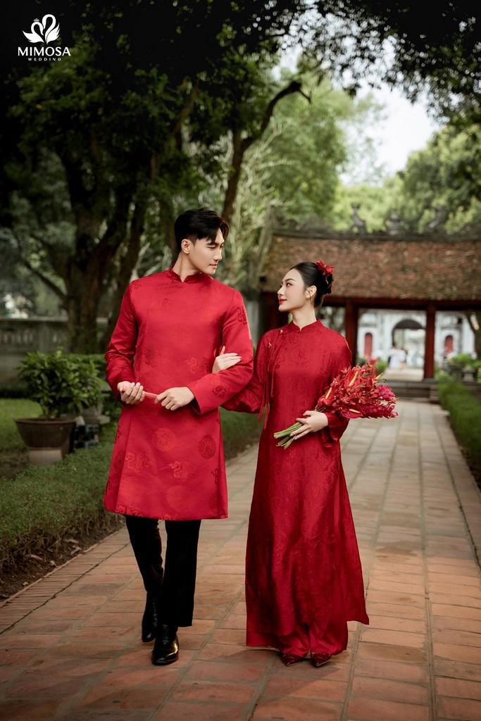 Tà áo dài đỏ thắm, không gian cổ kính với mái ngói rêu phong và hàng cây xanh mát tạo nên một khung cảnh vừa uy nghiêm vừa nên thơ. Lấy cảm hứng từ những buổi lễ truyền thống hoặc đơn giản là muốn tôn vinh trang phục dân tộc trong ngày trọng đại. Nếu dâu rể chọn concept này thì chọn trang phục áo dài đỏ truyền thống sẽ thể hiện được chất riêng lãng mạn và tinh thần của bộ ảnh. Liệu bạn có pải là người thích tà áo Việt Nam? Nếu có thì đây là concept dành cho bạn.