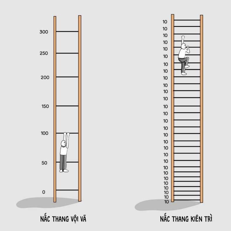 Cũng giống như Mark Twain từng nói “Bí quyết để tiến lên phía trước là hãy bắt đầu”. Và việc bắt đầu từ những bước đi chậm rãi vững chắc từ bước đi nhỏ có ý nghĩa rất thiết thực và to lớn với mỗi chúng ta. Trong cuộc sống, ước mơ, thành công, khát vọng luôn là những điều cao cả mà mỗi chúng ta đều hướng tới. Ấy thế mà con đường đi đến những điều đó lại không hề dễ dàng. Vì thế nó đòi hỏi ở mỗi chúng ta về sự kiên trì trong quá trình xuất phát từ những việc nhỏ. Người xưa thường nói “tích tiểu thành đại”, “góp gió thành bão” cũng chính vì vậy khi làm được những điều nhỏ bé đầu tiên ta sẽ có thể làm được những điều lớn hơn. Ta có thế thấy rằng sự “tham lam” chính là một trong những nguyên nhân chính gây ra sự trì hoãn giống như chiếc thang bên trái. Còn ngược lại nếu ta kỉ luật và kiên trì đi từng chút một ta sẽ có thể đạt được thành công mà ta mong muốn. Việc làm đều đặn và chắc chắn mỗi công việc sẽ giúp ta có tính trách nhiệm với chính bản thân và cộng đồng. Tiếp đó khi đi từ những bước nhỏ ta sẽ không cảm thấy chán nản và mất đi nguồn cảm hứng trong chính mình. Vì khi làm xong mỗi công việc ta sẽ có thêm động lực để làm những việc tiếp theo. Trải qua quá trình làm việc lâu dài với thói quen ấy ta sẽ nhanh chóng đến đích ước mơ. Từ đó ta sẽ có cơ hội được toả sáng và khẳng định chính mình,, trở thành nguồn động lực to lớn tiếp sức cho nhiều người, đặc biệt là giới trẻ nhiệt huyết. Để đạt được điều đó chúng ta cần kiên trì vì kiên trì chính là chiếc chìa khoá vạn năng của mọi cánh cửa. Thay vì thực hiện những việc to lớn vì mục đích nhanh chóng ta nên chia nhỏ những việc ấy ra để thực hiện một cách dễ dàng. Minh chứng rõ nhất cho việc ta nên thực hiện những bước đi nhỏ chính là vị lãnh tụ kính yêu Hồ Chí Minh. Người cũng là người có ước mơ, khát vọng đó là có thể tìm ra con đường để giải phóng, độc lập, tự do cho dân tộc. Trên hành trình vạn dặm ấy Người không bắt đầu từ những công việc “đao to búa lớn” mà là những công việc hết sức tầm thường như quét dọn nhà bếp, khuân than, sửa đồng hồ,… rồi mới là những công việc lớn hơn như thuỷ thủ, thợ ảnh, phiên dịch, phóng viên,… Tất cả những công việc nhỏ bé ấy đã tạc lên hình ảnh một con người vĩ đại vì dân, vì nước không ngại khó ngại khổ. Đó chính là sức mạnh của những bước đi nhỏ mà ta cần học tập và noi theo gương Người.