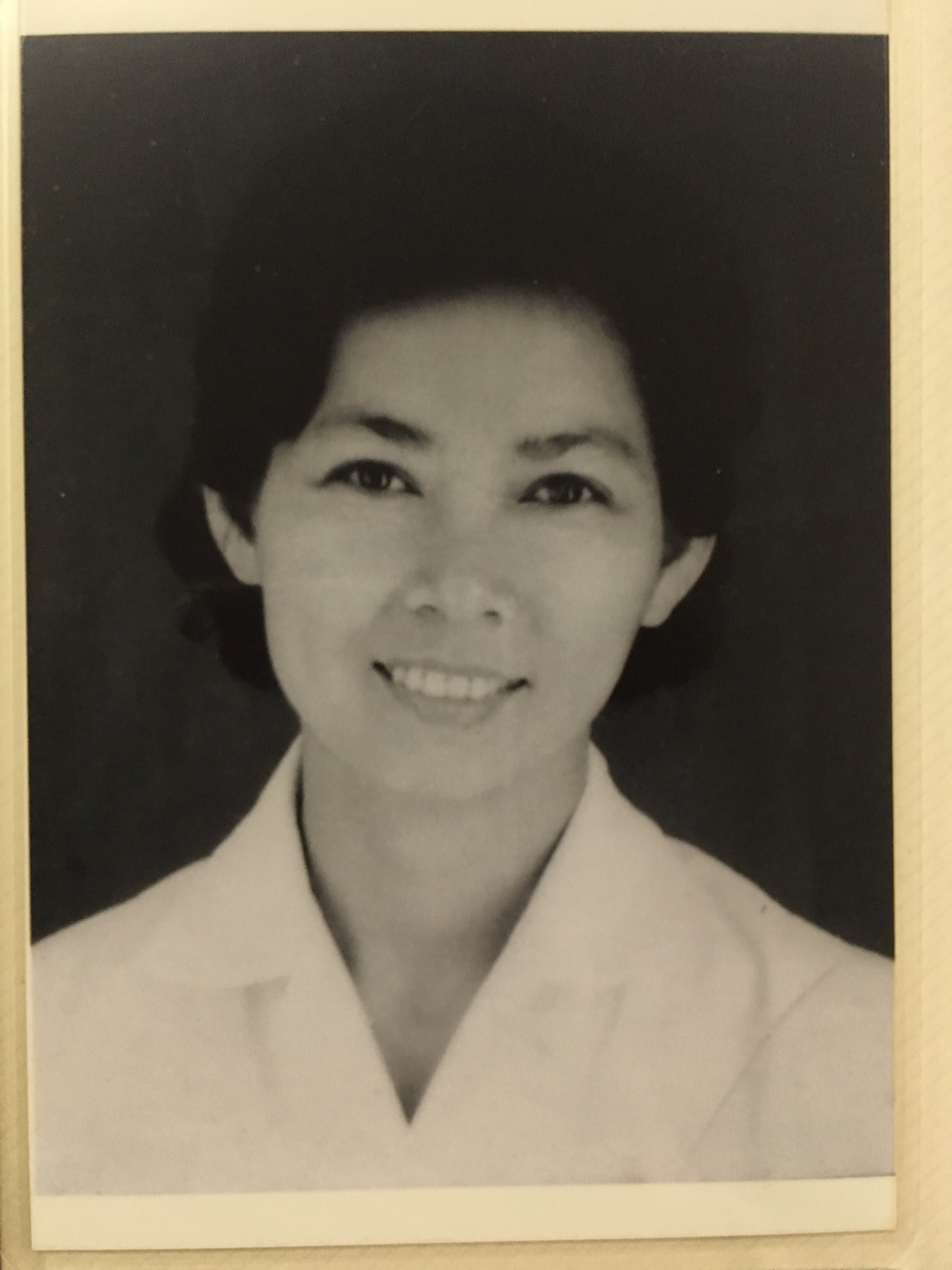 Bà Hân: Đúng rồi. Hình này là thời bà mới có con đầu lòng (*mẹ của tôi), thời đó bà chưa được làm phóng viên mà mới chỉ là thư ký Ban thôi. Hôm ấy, bà mới về nhà buổi trưa, rửa mặt, vội vàng phóng xe quay lại toà báo. Vừa cất xe thì nhà báo, nhiếp ảnh gia Trinh Hải bảo: “Hân, Hân vào đây anh chụp ảnh thử phim” và bấm một kiểu này. Không ngờ tấm hình đen trắng đơn giản này thôi mà bà vẫn thích mãi. Hồi này mới sinh xong nên có lẽ “thay máu” nên da dẻ hồng hào, tươi tắn hơn xưa nhiều.