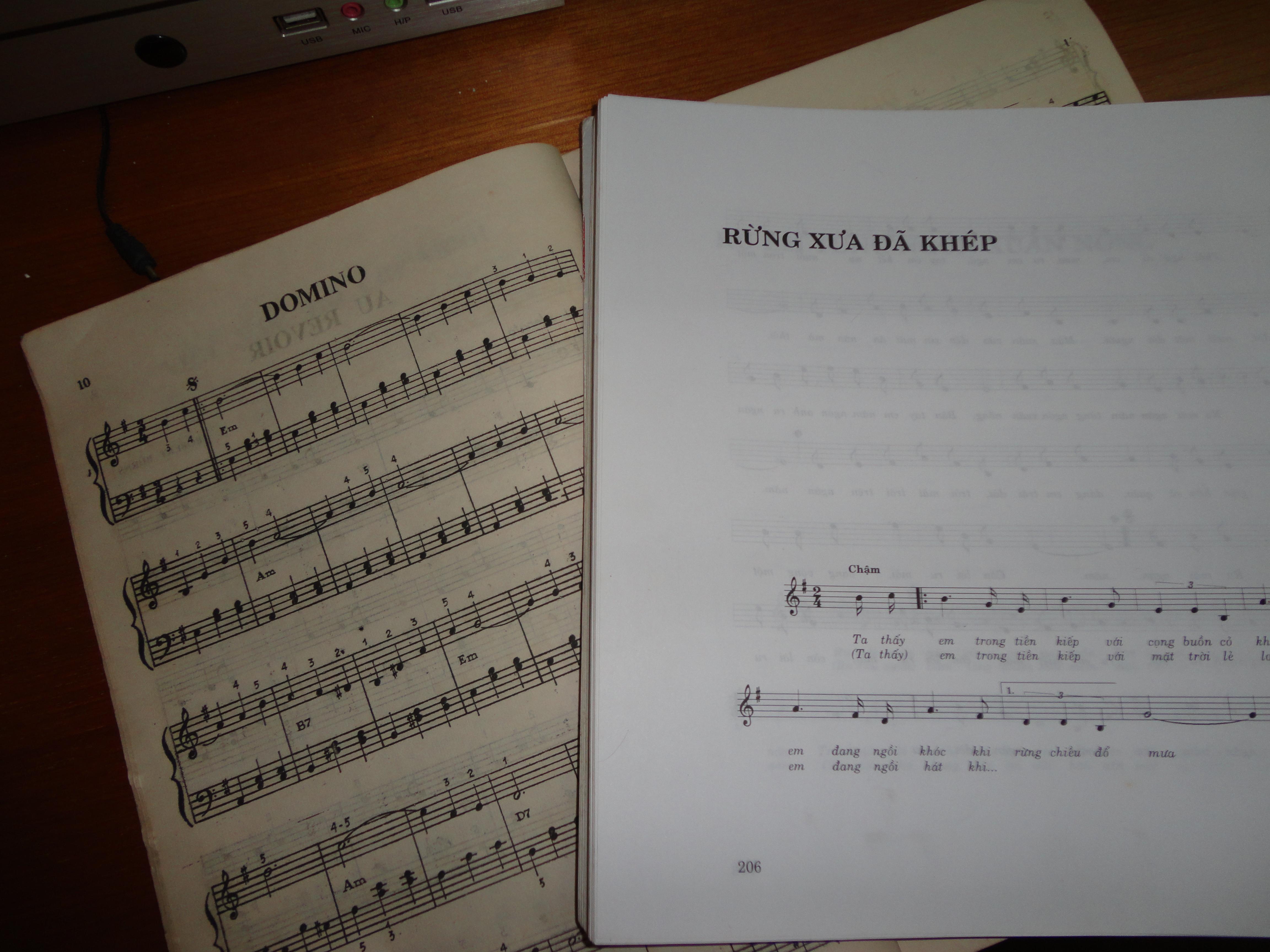 Ảnh minh họa: Bên trái, quyển sách cáu bẩn thời gian vì tôi đã sử dụng hồi bé và bây giờ sắp đến con gái 8 tuổi của tôi sử dụng để học đàn Piano. Bên phải là quyển ca khúc TCS thời sinh viên tôi đã mua, giá của nó cao hơn học bổng 40 ngàn đồng tháng của tôi. Hóa ra tôi đã phí tiền mua quyển sách có bài nhạc Pháp kia, vì nhạc sĩ đã đạo bài “Rừng xưa đã khép” của TCS. Tôi sẽ kiện NXB trả lại tiền cho mình.
