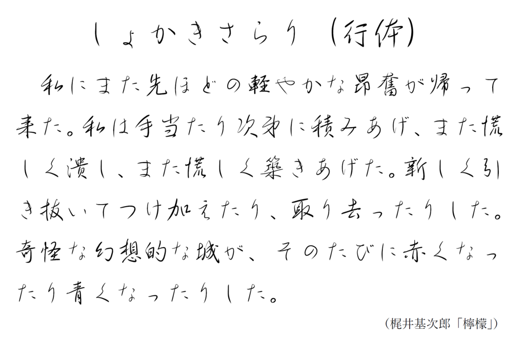 Shokaki Sarari (gyoshu) là một phông chữ viết tay đặc trưng bởi các ký tự trông như thể được viết bằng một cây cọ mỏng. Sự thay đổi nhẹ nhàng về áp lực lên cọ tạo cho người ta cảm giác như đang viết thư pháp.