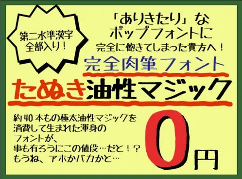Bút dạ Tanuki là phông chữ được tạo ra từ các ký tự viết tay bằng bút dạ dày trên giấy thông thường. Các chữ cái được in đậm nên chắc chắn sẽ nổi bật khi sử dụng trong tiêu đề hoặc tựa đề!