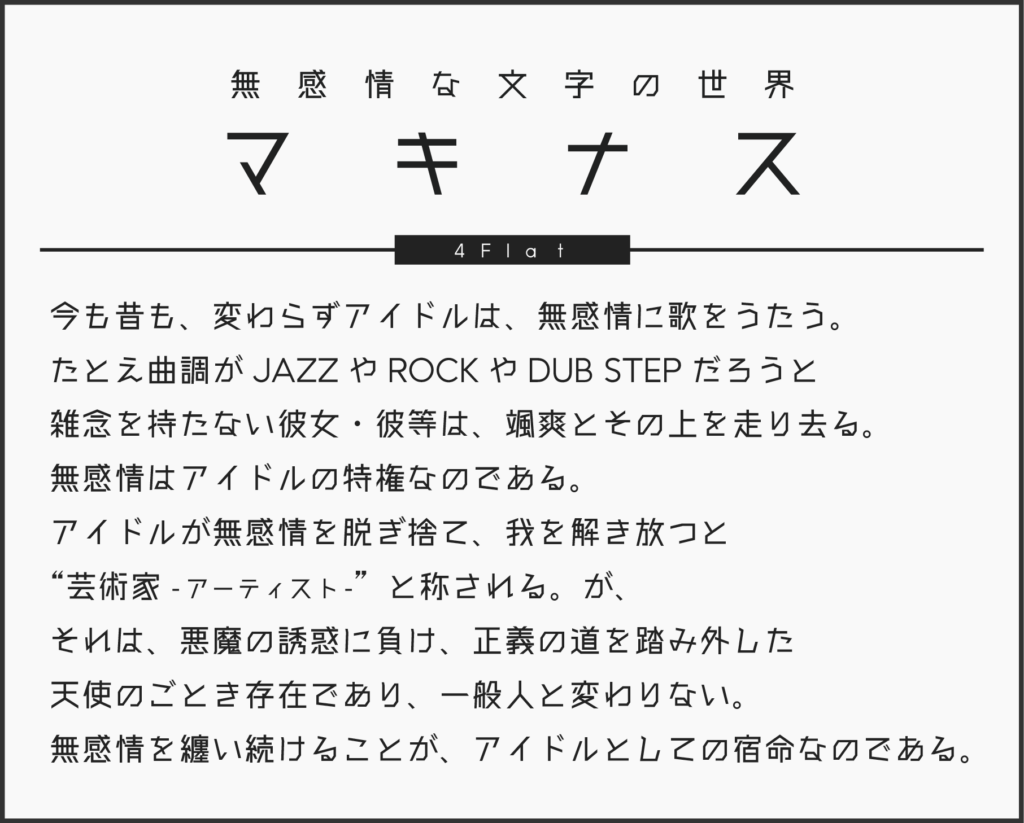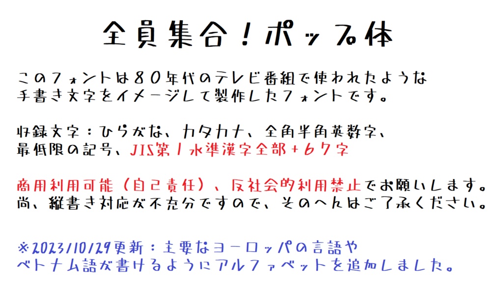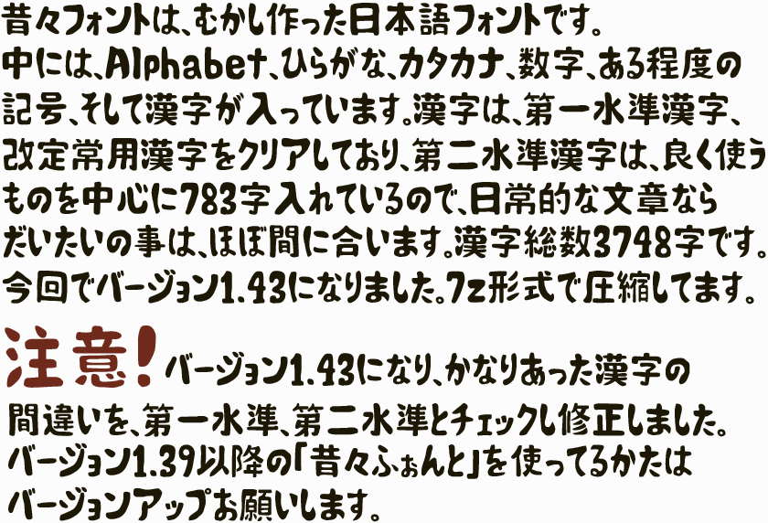 Đây là một phông chữ dễ thương và nổi bật, nhưng đặc biệt là chữ hiragana và katakana lại gợi cho người ta cảm giác hoài cổ. Tôi muốn sử dụng nó cho logo, tiêu đề, v.v.