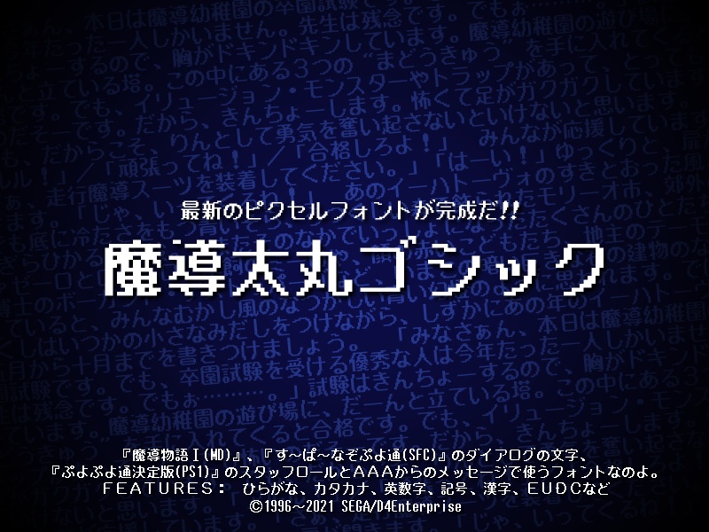 Madou Taimaru Gothic là phông chữ được thiết kế để gợi lại cảm giác của những trò chơi cổ điển như Super Nintendo. Trò chơi được tạo ra bằng cách tái tạo các nhân vật xuất hiện trên màn hình trò chơi như "Puyo Puyo" và "Madou Monogatari". Đây là phông chữ gợi cho bạn cảm giác hoài niệm!