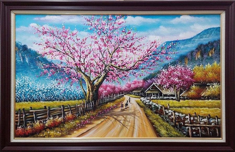 Bức tranh “Con Đường Mùa Xuân” được vẽ bằng sơn dầu cao cấp, từng lớp màu được nghệ nhân xử lý kỹ lưỡng để tạo độ sâu và độ nổi tự nhiên.