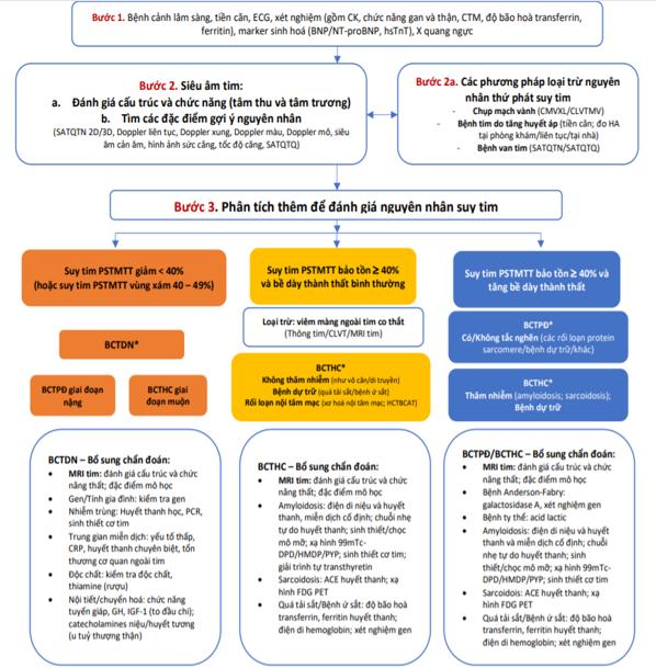 ACE, angiotensin-converting enzyme; BCTDN, bệnh cơ tim dãn nở; BCTHC, bệnh cơ tim hạn chế; BCTPĐ, bệnh cơ tim phì đại; BNP, B-type natriuretic peptide; CK, creatine kinase; CRP, C-reative protein; CTM, công thức máu; CLVTMV, cắt lớp vi tính mạch vành; CMVXL, chụp mạch vành xâm lấn; ECG, điện tâm đồ; ECV, extracellular volumne, dịch ngoại bào; FDG, flourodeoxyglucose; HA, huyết áp; HCTBCAT, hội chứng tăng bạch cầu ái toan; HMDP, hydroxymethylene diphosphonate; hsTnT, high sensitive troponin T, troponin T siêu nhạy; IGF-1, insulin growth factor-1; 99mTc-DPD, technetium-99m 3,3- diphosphono-1,2 propanodicarboxylic acid; NT-proBNP, N-terminal pro B-type natriuretic peptide; PCR, polymerase chain reaction; PET, positron emission tomography; PYP, pyrophosphate; PSTMTT, phân suất tống máu thất trái; SATQTN, siêu âm tim qua thành ngực; SATQTQ, siêu âm tim qua thực quản; SPECT, single photon emission computed tomography.