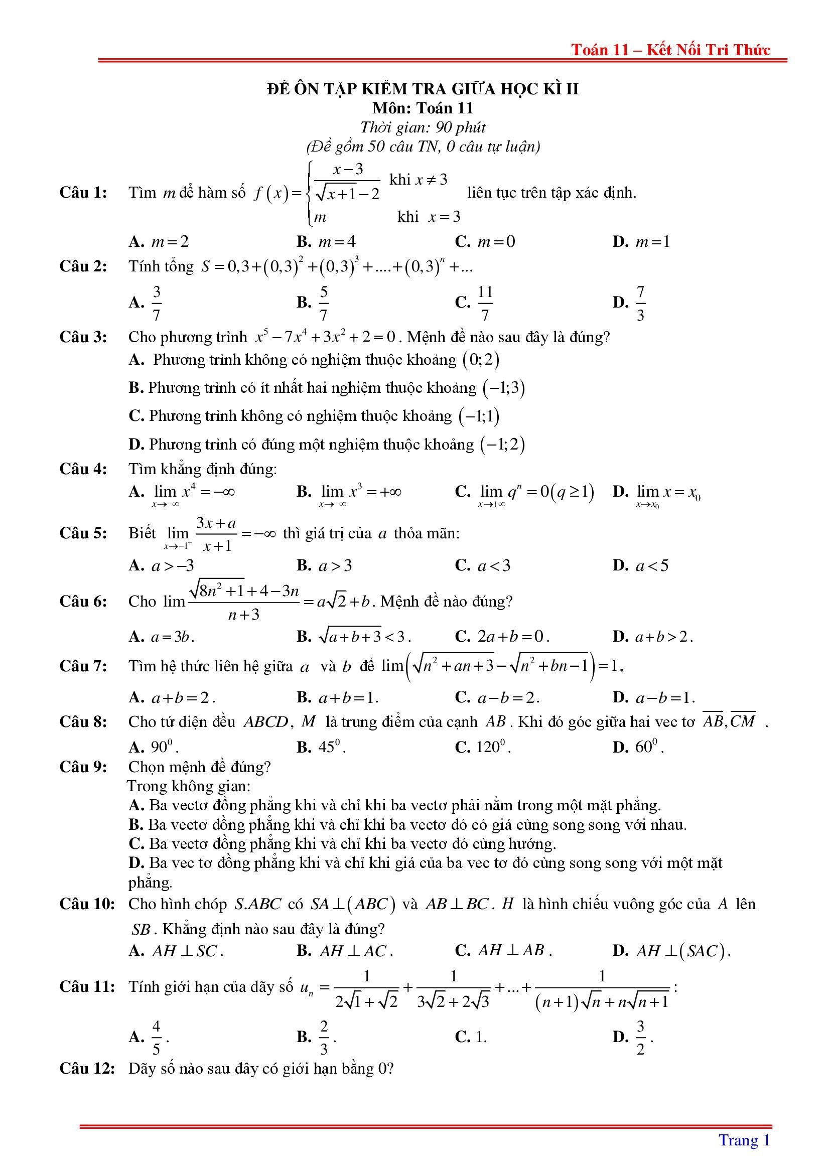 2. Đề thi giữa kì 2 môn Toán 11 Kết nối tri thức