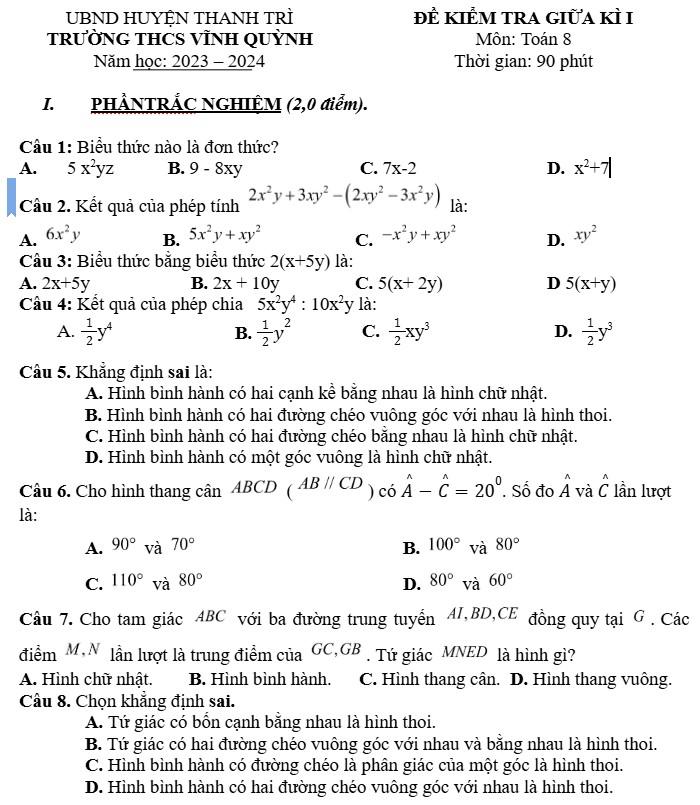 3. Đề thi học kì 1 lớp 8 môn toán: Đề số 2