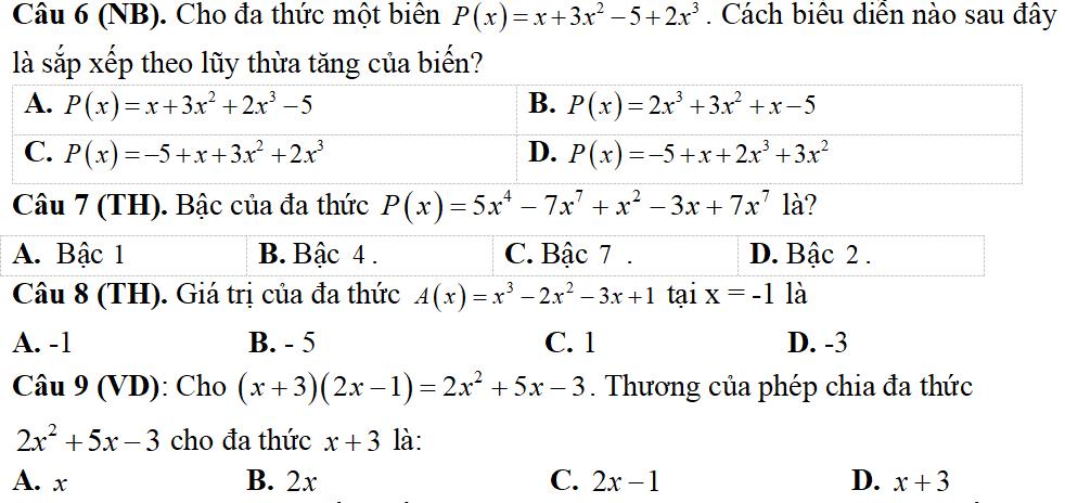 Câu 4((TH): Sắp xếp đa thức 6x3 + 5x4 - 8x6 - 3x2 + 4 theo lũy thừa giảm dần của biến ta được: