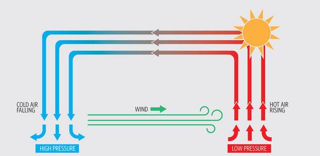 Sự chênh lệch này càng lớn, thì tốc độ di chuyển của luồng không khí càng tăng, gió thổi càng mạnh và ngược lại.