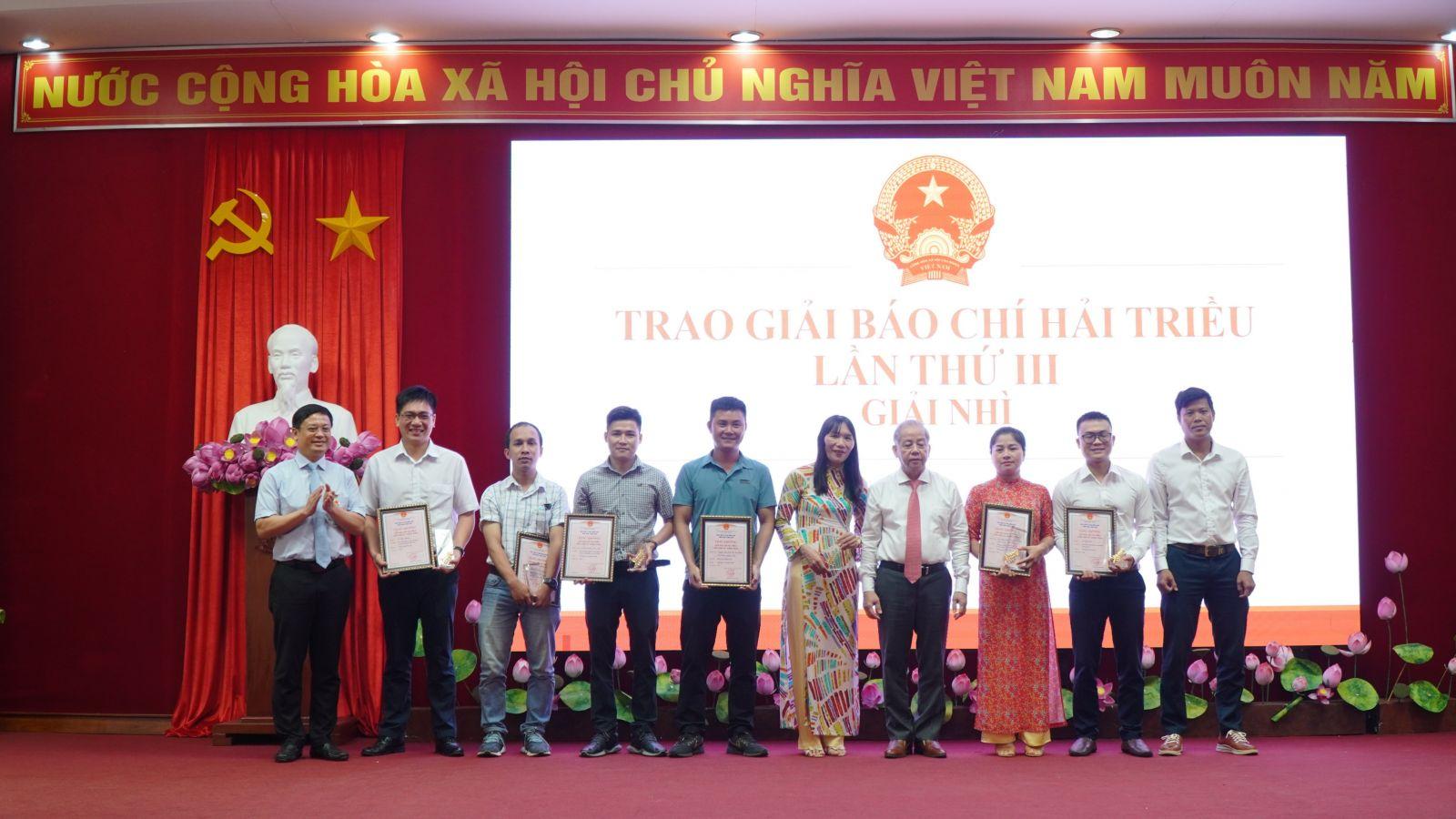 Phó Bí thư Thường trực Tỉnh uỷ Phan Ngọc Thọ và Phó Chủ tịch Thường trực UBND tỉnh Nguyễn Thanh Bình trao giải Nhì cho các tác giả nhóm tác giả đoạt giải Báo chí Hải Triều lần thứ III - năm 2022