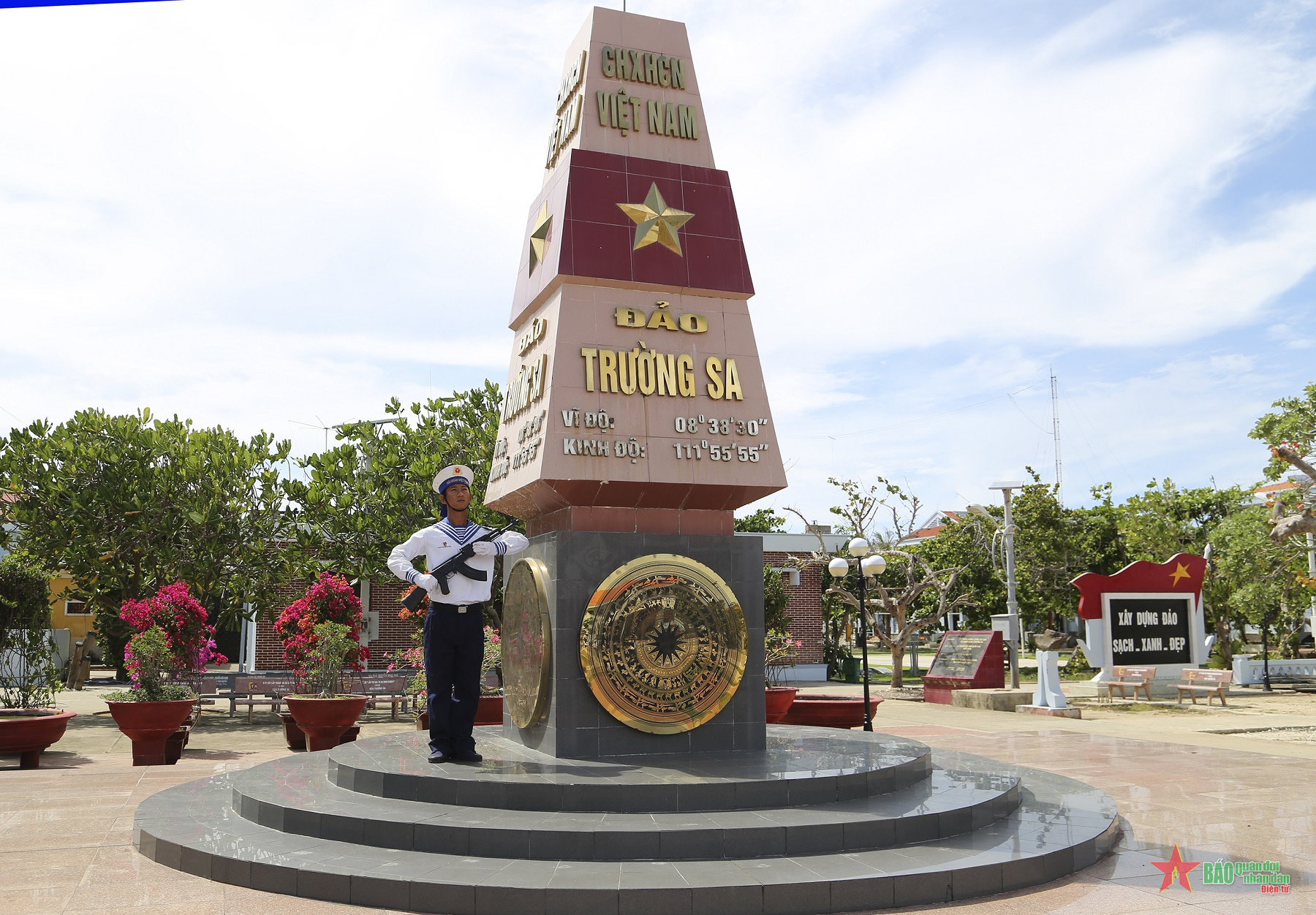 Chiến sĩ đảo Trường Sa đứng gác bên cột mốc chủ quyền. Ảnh: QUANG TIẾN