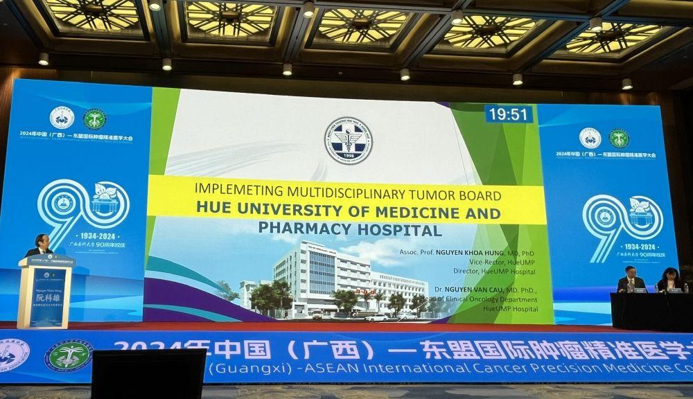 Ung thư là một nhóm bệnh lý ác tính đa dạng và phức tạp không chỉ ảnh hưởng đến cơ quan ung thư mà còn tác động toàn diện đến sức khỏe thể chất, tâm lý và chất lượng sống của bệnh nhân. Việc chẩn đoán và điều trị ung thư cần nhiều lĩnh vực chuyên môn khác nhau nên một chuyên khoa không thể đảm đương hết nhiệm vụ quản lí một bệnh nhân ung thư. Vì vậy, hội chẩn ung thư đa chuyên khoa (Multidisciplinary Tumor Board - MTB) đang là xu thế, là một bước tiến chuyên môn quan trọng trong quản lý toàn diện bệnh ung thư hiện nay. Trước xu thế đó, PGS.TS Nguyễn Khoa Hùng, Giám đốc Bệnh viện, đã có chủ trương cần sớm thành lập và đưa vào hoạt động mô hình MTB tại Bệnh viện Trường. Sau một thời gian chuẩn bị, được sự nhất trí cao của các bác sĩ chuyên khoa, MTB đã được thành lập, đi vào hoạt động đều đặn, đến nay đã trở thành một hoạt động thường quy tại Bệnh viện Trường Đại học Y Dược Huế. Trong tháng 11 vừa qua, PGS.TS Nguyễn Khoa Hùng và TS. Nguyễn Văn Cầu đã được mời tham dự và chia sẻ về hiệu quả bước đầu của mô hình hội chẩn ung thư đa chuyên khoa tại Hội nghị Ung thư Trung Quốc - ASEAN tổ chức tại Quảng Tây, Trung Quốc.