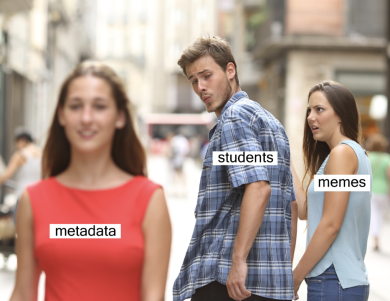 Other examples, such as this student-made meme that makes light of my desire to get the class to care about metadata, rely on the very same formula. This formula—selecting and arranging expressive parts kept apart—is the basic, aesthetic DNA of all those millions of funny images we call memes. To make image memes is to develop variously funny, banal or disturbing arrangements out of a giant repertoire of possible materials, or what I call “constituents.” Part of the joy (or the horror) of memes is seeing someone assemble something you didn’t quite expect to be assembled, or seeing them assemble in a way you hadn’t seen somebody assemble before.