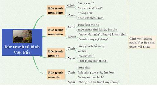 Việt Bắc bức tranh tứ bình là một đoạn trích thể thiện được bút pháp miêu tả thiên nhiên đầy trữ tình của nhà thơ Tố Hữu. Để phân tích bức tranh tứ bình Việt Bắc, các em hãy thm khảo sơ đồ tư duy dưới đây: