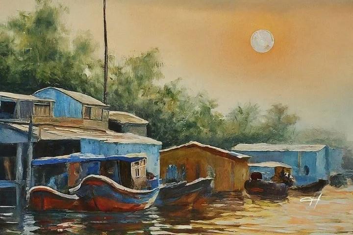 Tôi ngồi đó, chết lặng giữa cái trùng phùng của sóng nước, của ẩm thực, và của âm nhạc. Tôi yêu cái khoảnh khắc ấy. Yêu như yêu mấy cô mặc đồ bà ba lụa, lướt đi mềm mại, mơ hồ trong những căn nhà chòi mái lá để phục vụ khách. Họ không đi, họ “lướt”, nhẹ như một làn khói.