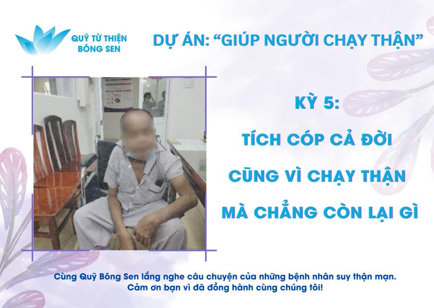 Chú Võ V. P. (1967) tính đến năm nay đã chạy thận được 21 năm. Trước đây chú làm thợ cơ khí nhưng do chạy thận nhiều năm sức khỏe giảm sút nên trong một lần làm việc chú tự té ngã dẫn đến gãy hai chân và ảnh hưởng xương sống. Kể từ đó chú cũng mất việc và phải di chuyển bằng xe lăn. Việc đổ bệnh khiến kinh tế của chú P. khó khăn đến mức phải bán nhà để chạy chữa. Sau ly hôn, chú P. chuyển đến sống chung với em gái là công nhân may. Thương anh bệnh tật không có ai chăm sóc, em gái chú P. mỗi tháng đều gửi chú 5 triệu để lo viện phí, sinh hoạt và phí di chuyển taxi chạy thận. 5 triệu có lẽ là con số lớn với nhiều người nhưng đối với chú P. thì không đủ dù đã cố gắng chắt bóp dè sẻn.