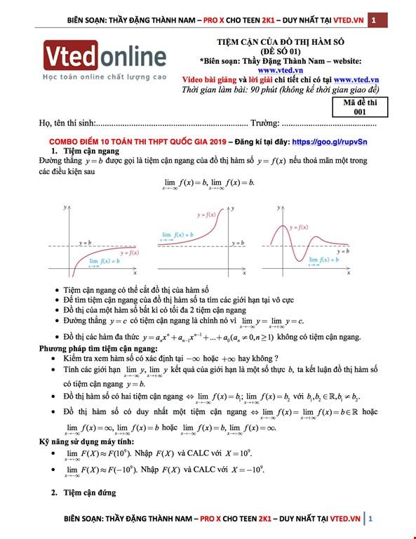 Đây là hệ thống câu hỏi trắc nghiệm từ cơ bản đến nâng cao của chủ đề đường tiệm cận của đồ thị hàm số do thầy Đặng Thành Nam biên soạn, được trích lược từ Kho đề thi của khoá học COMBO X 2019 dành cho học sinh 2k1 tại Vted.vn.