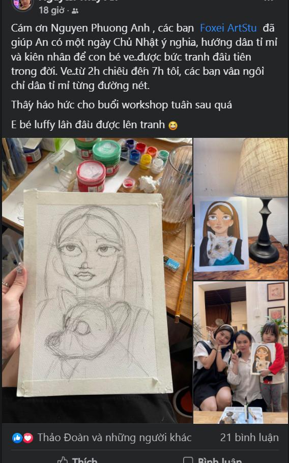 Chị An: “Cám ơn Nguyen Phuong Anh , các bạn Foxei ArtStu đã giúp An có một ngày Chủ Nhật ý nghĩa, hướng dẫn tỉ mỉ và kiên nhẫn để con bé vẽ được bức tranh đầu tiên trong đời. Vẽ từ 2h chiều đến 7h tối, các bạn vẫn ngồi chỉ dẫn tỉ mỉ từng đường nét. Thấy háo hức cho buổi workshop tuần sau quá E bé luffy lần đầu được lên tranh