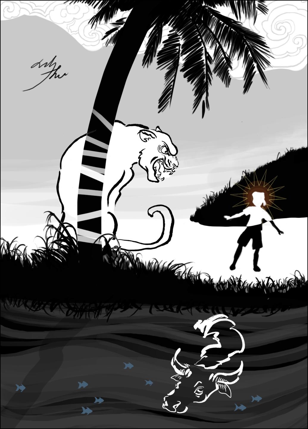 Tiger bared his fangs, as if to make the point clear, but the farmer said nothing and lit the tree on fire before leading his buffalo away.