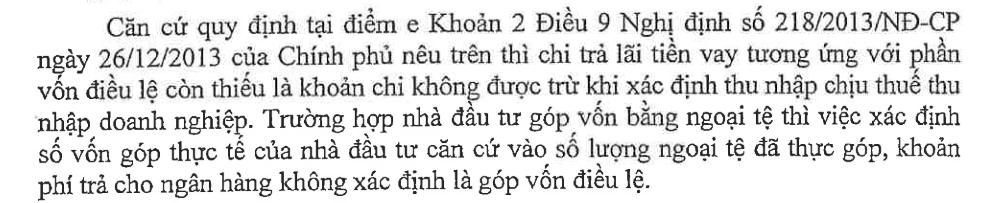 + Nếu doanh nghiệp chỉ phát sinh một khoản vay thì khoản chi trả lãi tiền không được trừ bằng số vốn điều lệ còn thiếu nhân (x) lãi suất của khoản vay nhân (x) thời gian góp vốn điều lệ còn thiếu.”