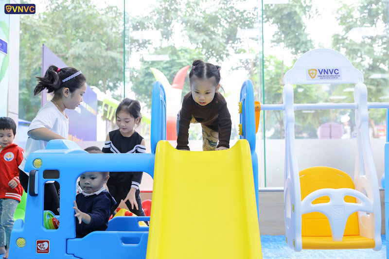 Khu vui chơi rộng rãi và nhiều đồ chơi giúp bé thoải mái khi đi tiêm
