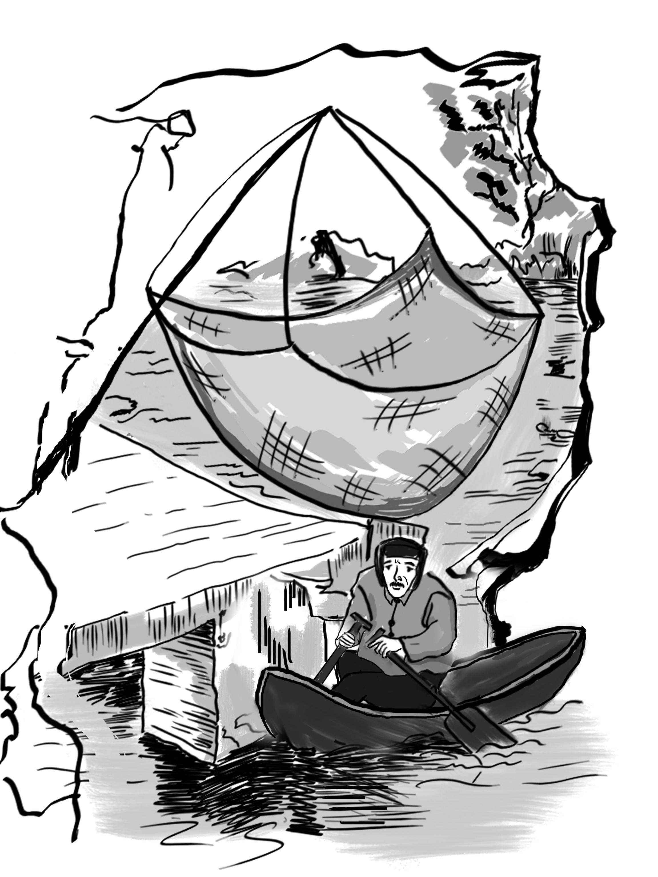 Minh họa: THÁI AN. Vặn to cái đèn chai treo góc vách nhà, ông rờ rẫm đi ra ngoài. Tiếng gió đập phên nứa phành phạch và tiếng trèo trẽo của gọng vó căng lưới cản gió. Lắng nghe một lúc, nhìn bốn phía chả thấy gì ngoài màu tôi tối quen thuộc, ông chài tiến đến chiếc cọc chân thang treo đèn vào cái đinh thuyền rồi chậm rãi cởi chão hạ bè vó xuống sông. Ông lắng tai nghe ngóng một hồi, đang định xách đèn chui vào nhà thì nghe có tiếng người phía bên kia mố cầu: “Ông ơi, cứu cháu với!”. Ông định thần nơi phát ra tiếng kêu cứu, quả quyết xách đèn sang phía mố cầu bên kia. Tiếng kêu nhỏ lẫn trong gió phều phào: “Ông ơi, cứu cháu với!” lại thoảng lên. Ông chài đến sát tiếng kêu. Cặp mắt kèm nhèm của ông nhận ra ngay trong cái hốc sát mố cầu, một người bị mắc kẹt dưới ấy, giọng đàn bà con gái. Ông tiến lại bảo: “Khổ thân. Ai mà đêm hôm sa xuống đây thế?”. Người dưới hố giọng rất yếu vọng lên: “Cháu, cháu lạc đường... tưởng còn cầu định qua sông thì ngã xuống đây, ngã từ lúc chập tối”.